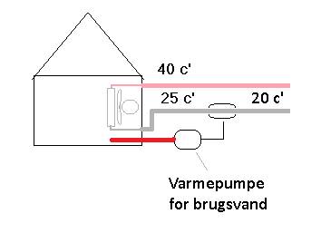 En varmepumpe monteres for højtemperatur varme til boligen og brugsvand. Varmepumpen køler retur!