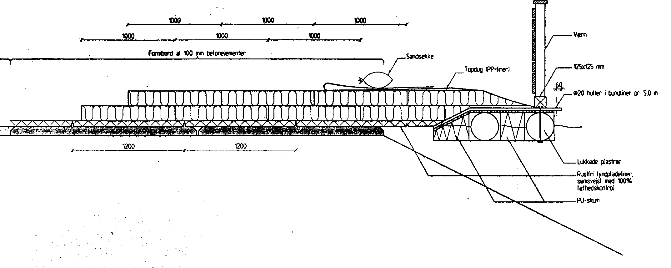 Plastløsningen opbygges i moduler på land, som efterfølgende samles. Opbygningen er vist i fig. 5.