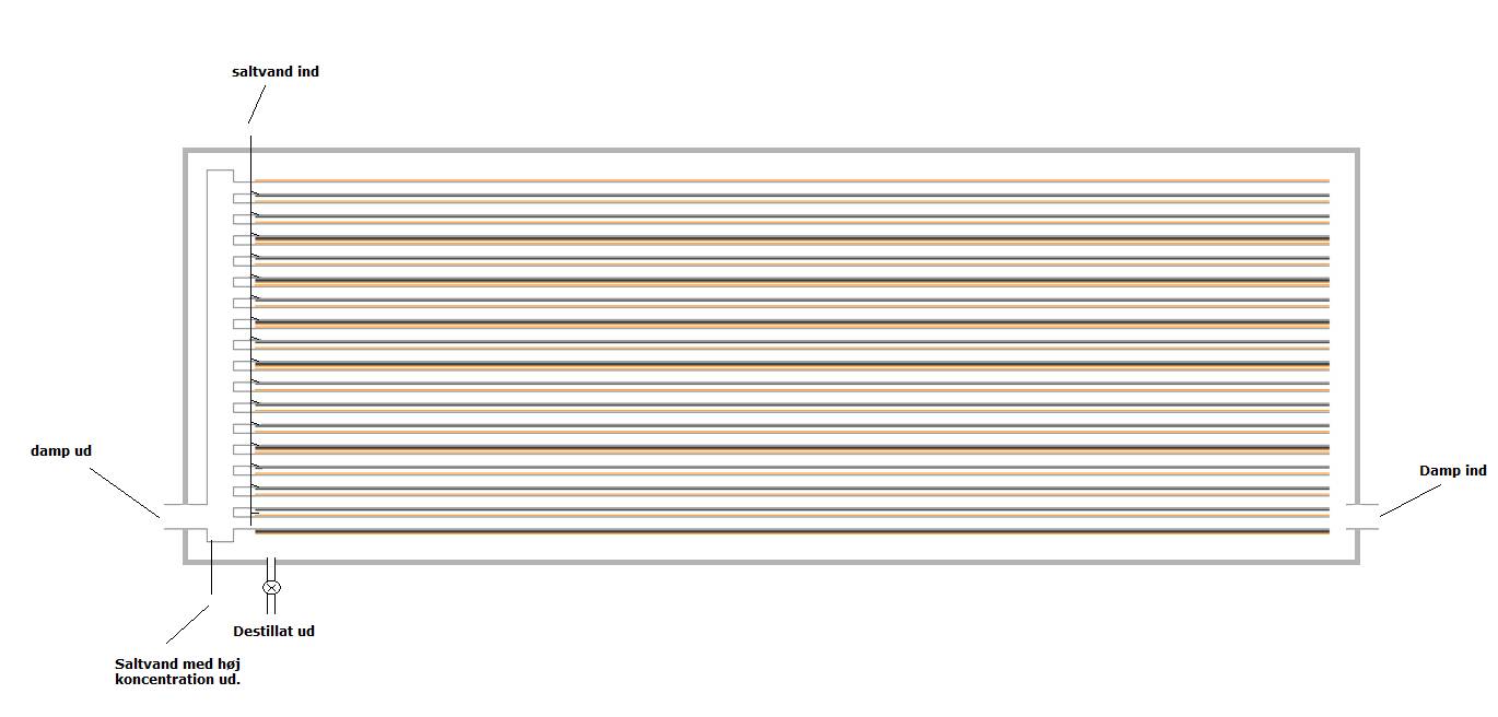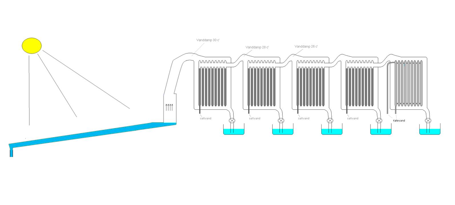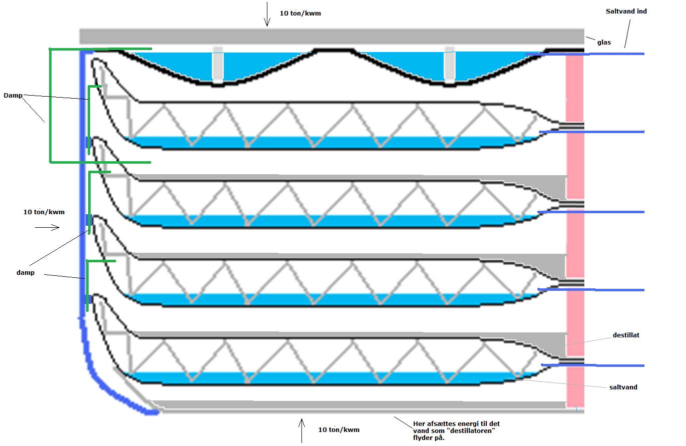 Her koger saltvand i trin ned gennem opbygningen ved et lavere tryk og dermed koge/kondenseringstemperatur.