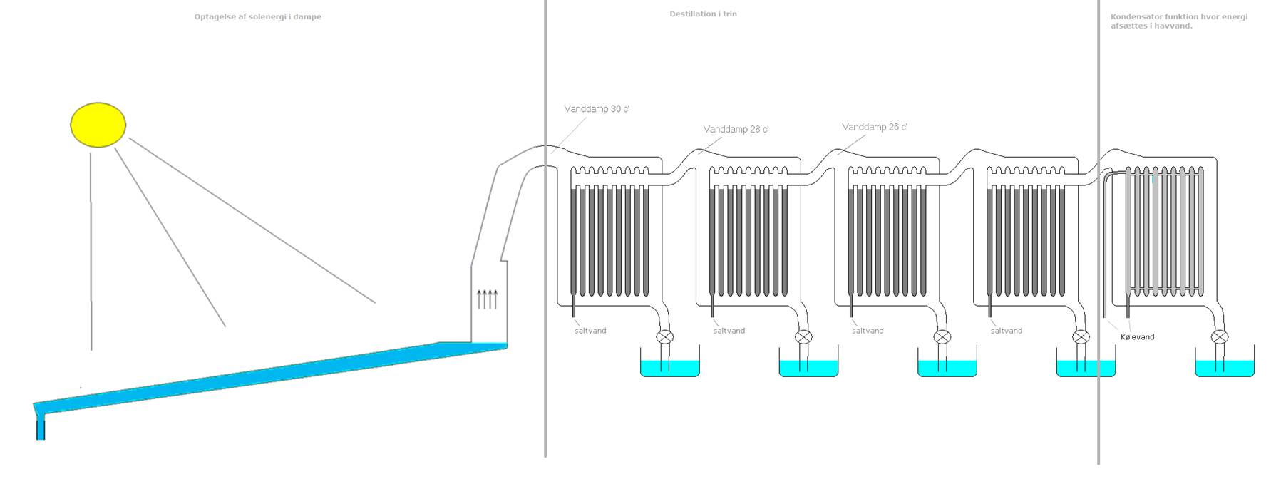Funktionsprincippet omkring processen kan herefter inddeles i en kogedel eller en solfangerdel, hvor solens energi optages ved at koge slatvand og energien er herefter bundet i dampe. Anden Del: er destillation i trin. Tredje del: kondensatorfunktion hvor den optagende energi i systemet afsættes ved en lav temperatur i feks. Havvand via en alm. varmeveksler som er saltvand bestandig. Se.